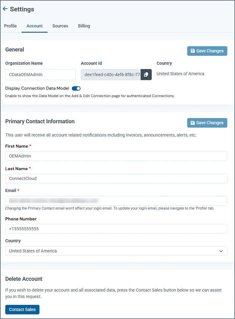 If you want to delete your Connect AI Embed account and all of its data, click Contact Sales for assistance.Account deletion is permanent. If you delete your account, you need to create a new account if you want to use Connect AI Embed in the future.
